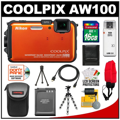 Nikon Coolpix AW100 Shock & Waterproof GPS 16.0 MP Digital Camera (Orange) with 16GB Card + Battery + Case + Floating Strap + HDMI Cable + Flex Tripod + Accessory Kit Review